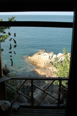 View from the little bungalow, both straight out (onto the ocean) and sidewards (where you can see the water all the way down the hill).