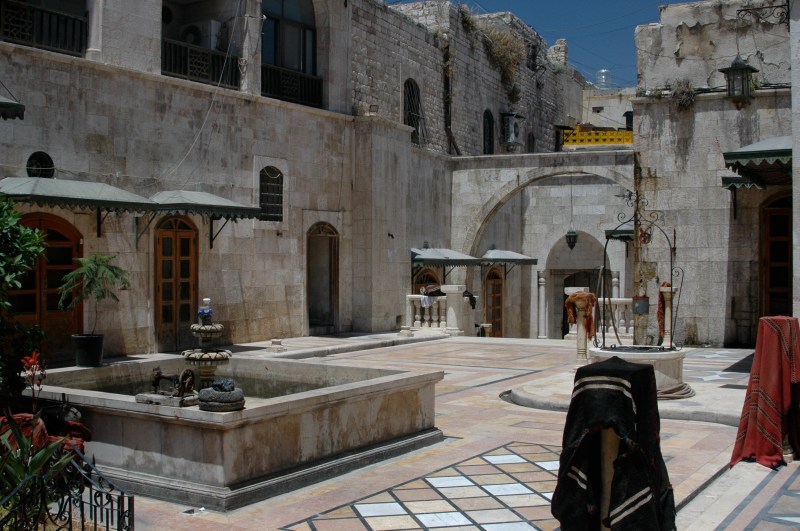 A big part of Syrian architecture, at least in the larger and wealthier cities, is “Courtyard housing”. Building one or more houses around a central courtyard became popular in Iraq and Syria, as the Arabs adjusted to living in the city, coming from the nomadic desert life where they’d place their tents around a common area, where the family would live and work. Courtyards in Islamic architecture add additional privacy, as they are not visible from the outside, allow for better control of sunlight and shade in hot temperatures, and a special, covered area called an “Iwan” allows for a covered area from where the courtyard can be enjoyed, or where music can be performed with great acoustics towards the courtyard.